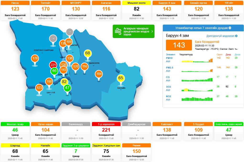 Агаарын чанарын индексээр өнөөдөр буюу хоёрдугаар сарын 11-ний өдрийн 12:00 цагийн байдлаар Нэгдүгээр хороолол /221/ орчимд агаар маш их бохирдолтой байна.